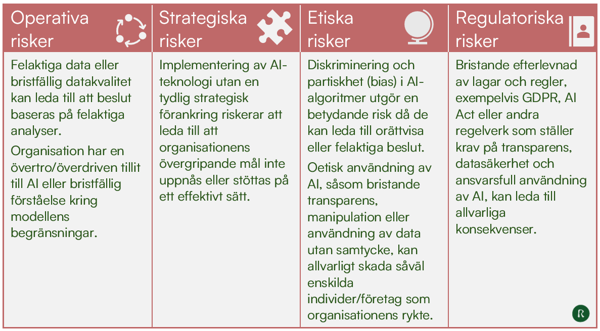 AI-risker kan identifieras inom riskkategorierna: operativa, strategiska, etiska och regulatoriska. I figuren nedan exemplifieras AI-risker utifrån orsak och påverkan inom dessa riskkategorier: